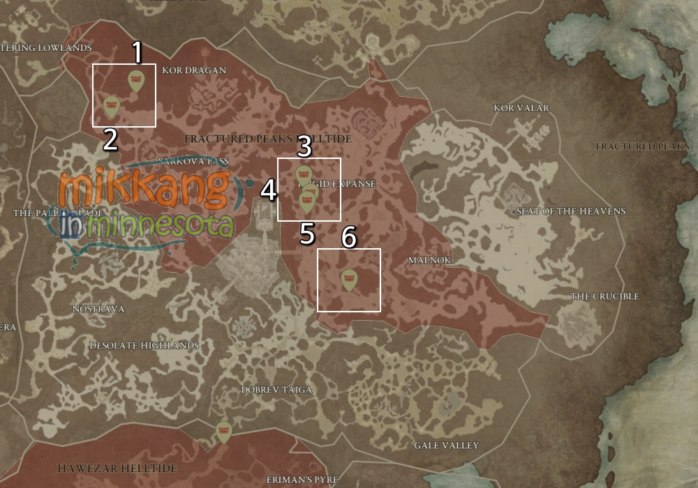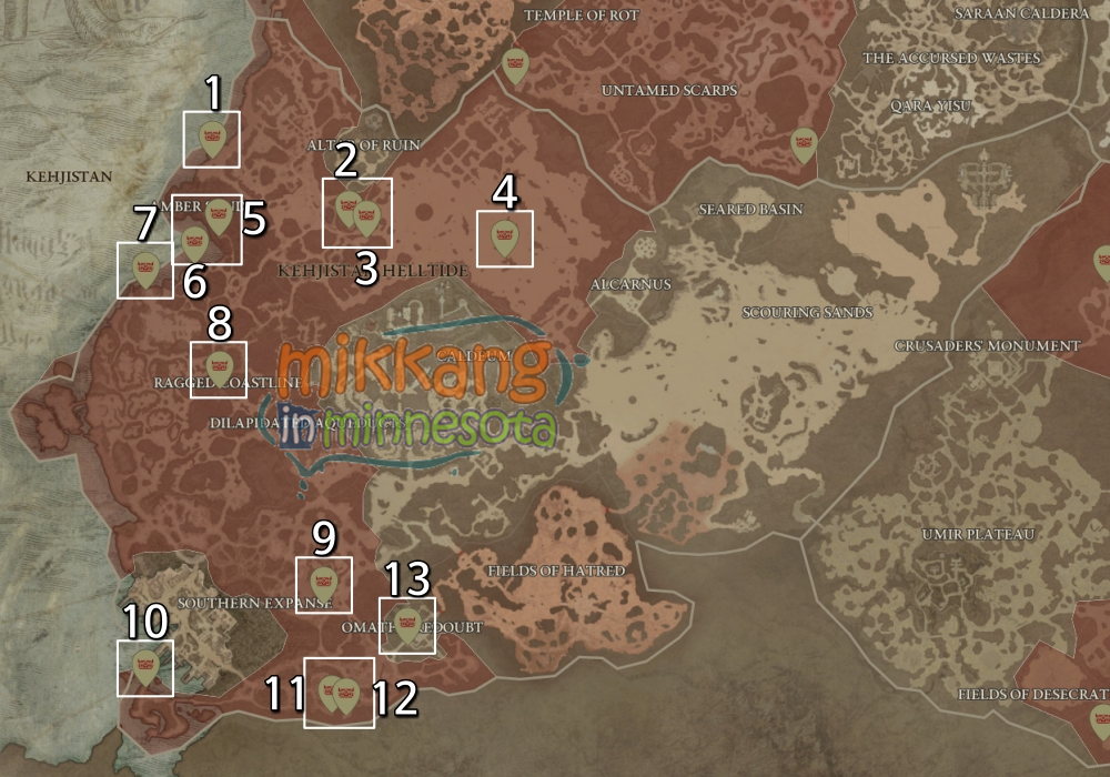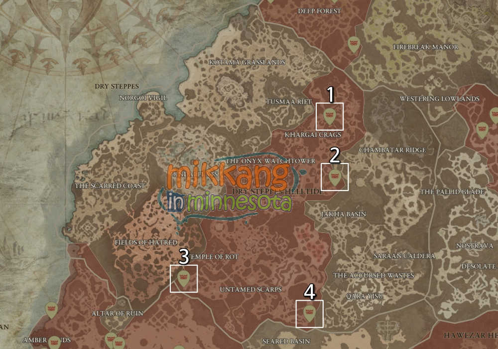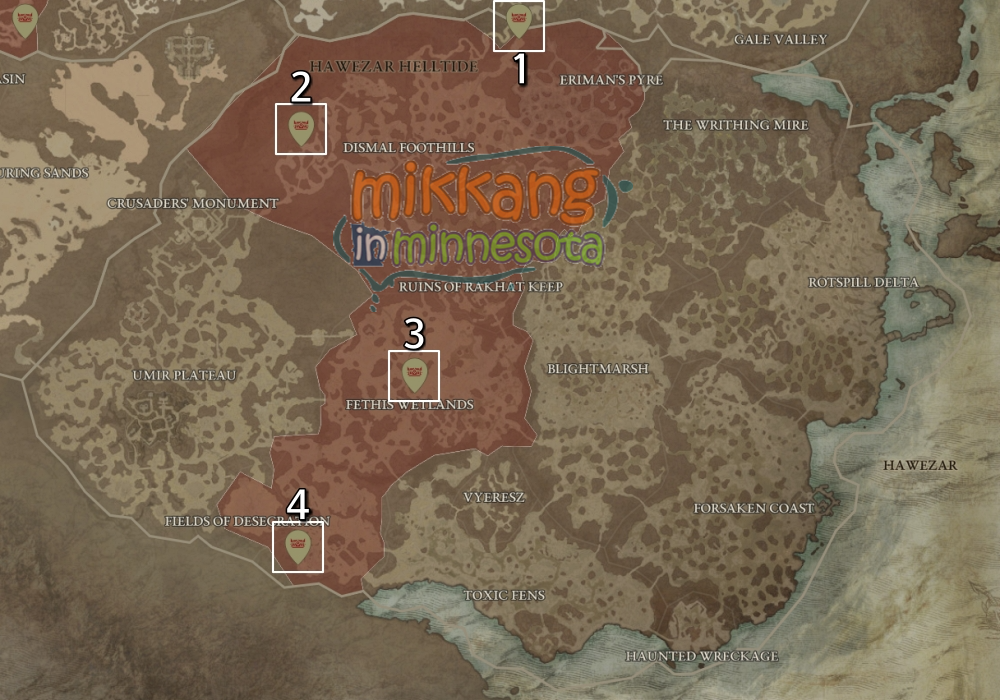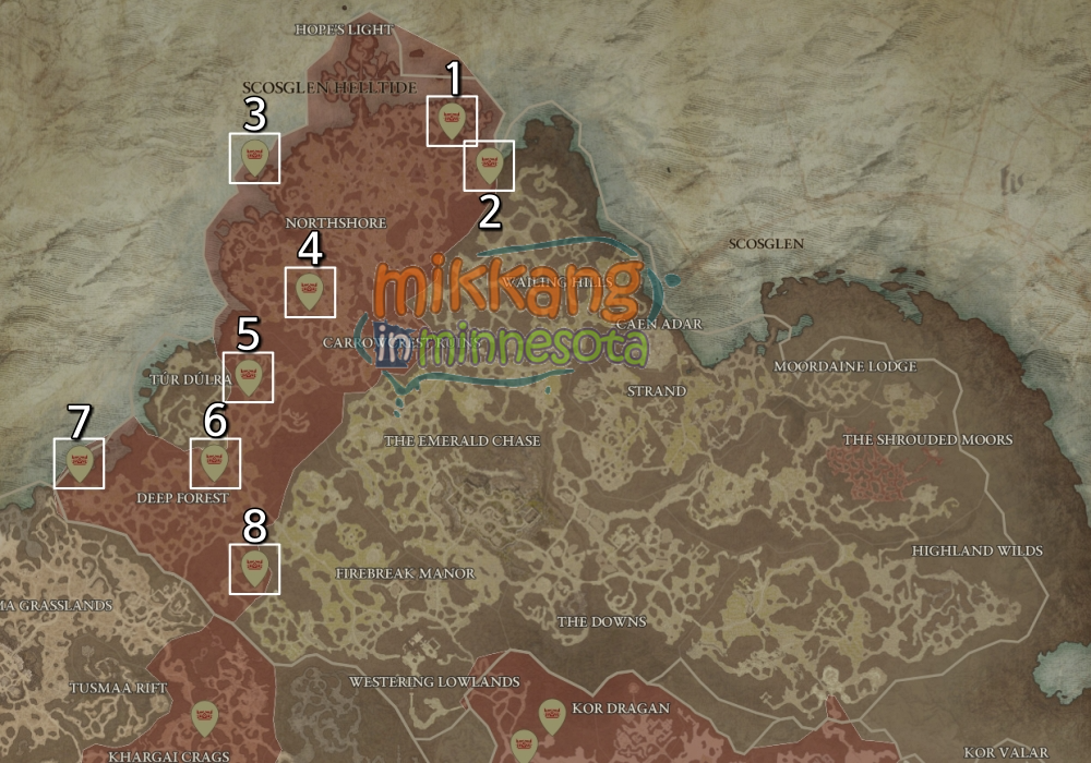 아래 지도들은 각 지역별 수수께끼의 고통받는 선물 위치를 표시했고, 디아블로4 맵에서 제공하는 지도를 바탕으로 제작했다.