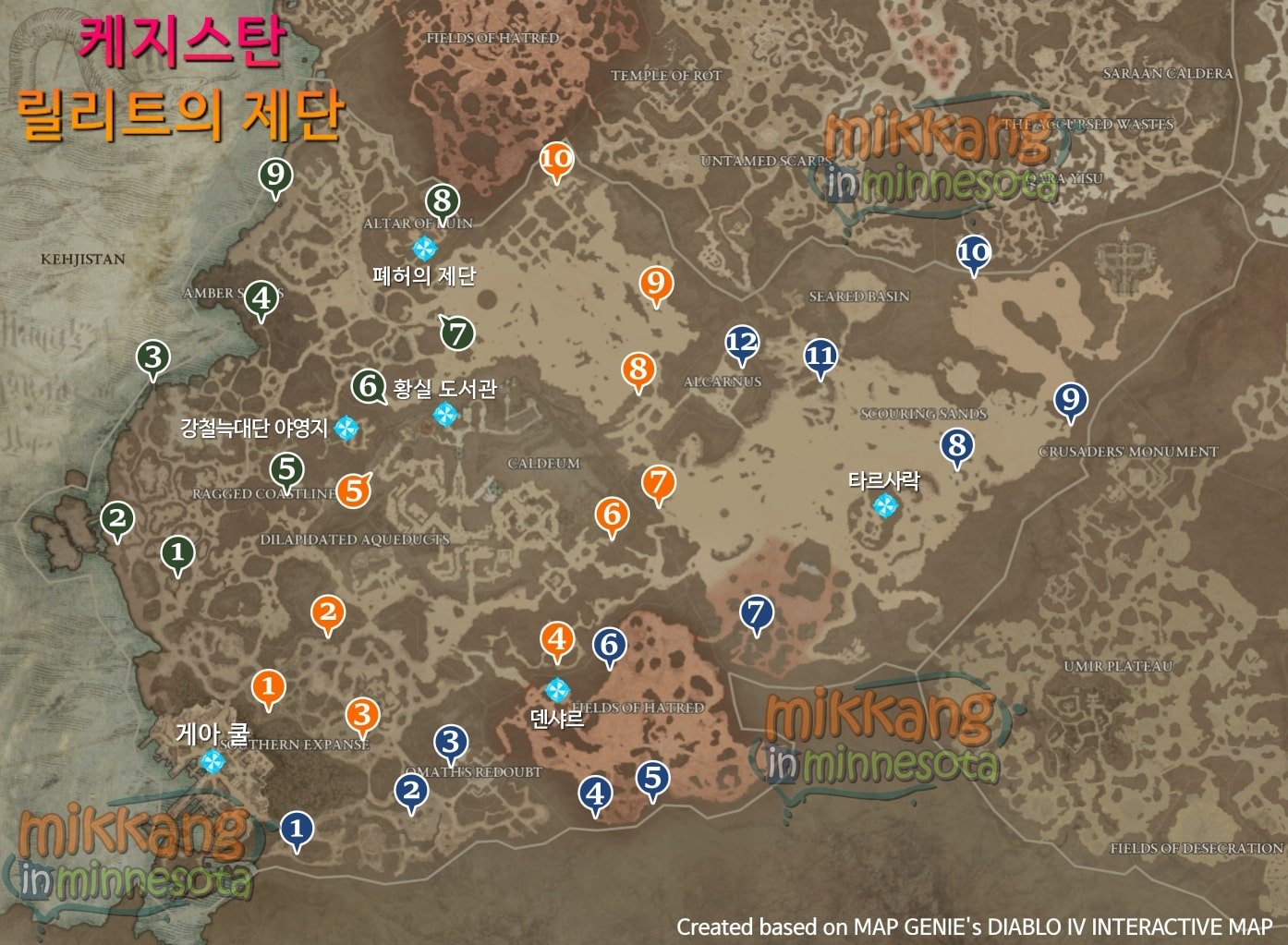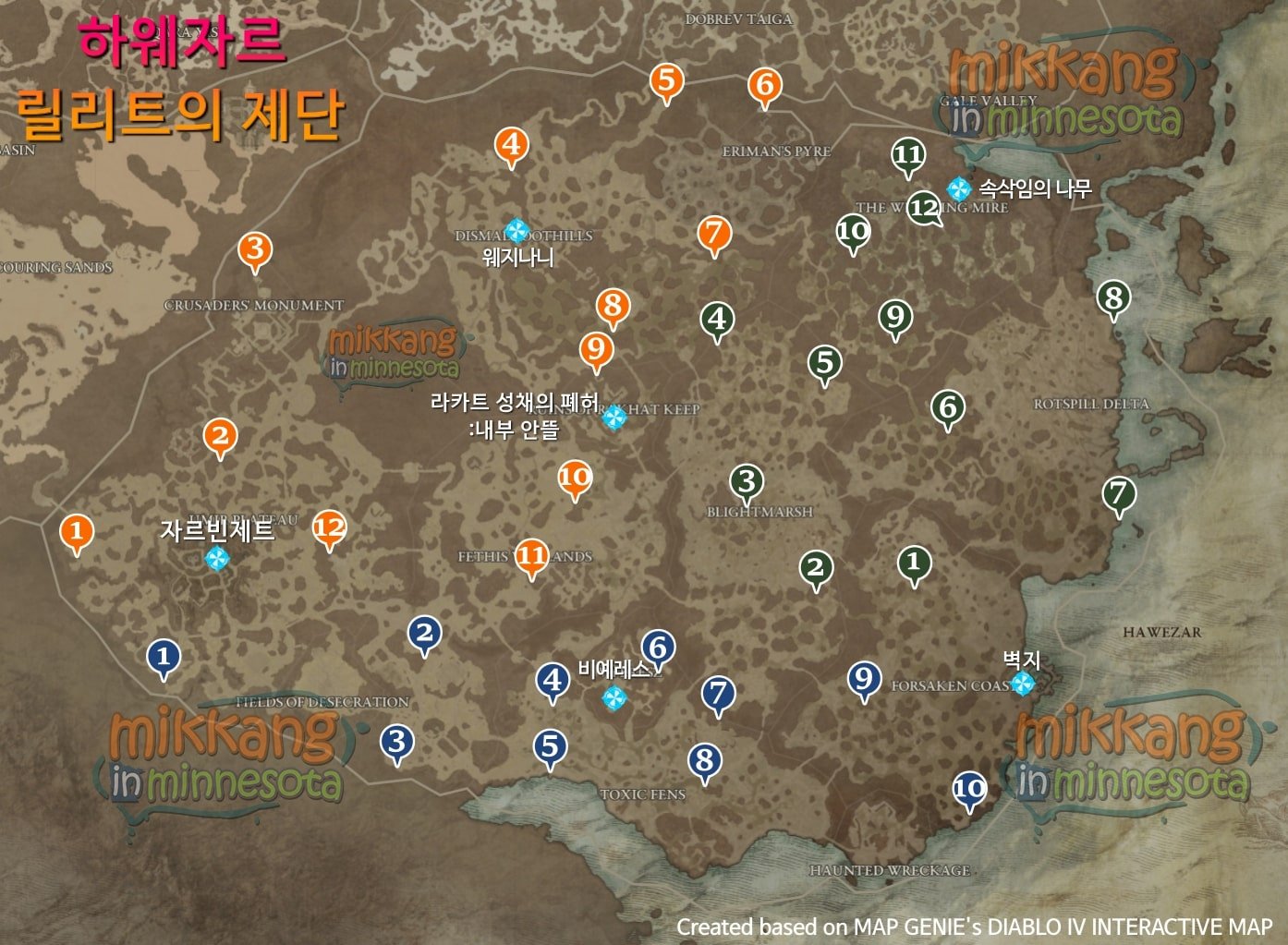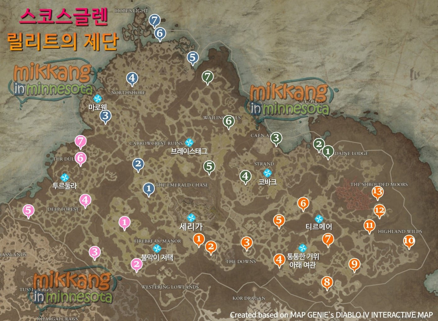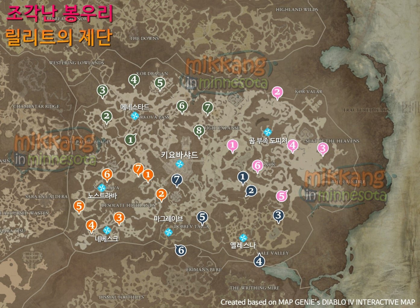 아래 각 지역별로 숨겨진 릴리트의 제단 위치와 간단한 경로를 색깔과 숫자로 표시해 두었다.
