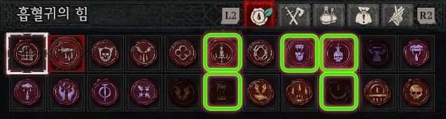 이런 빌드에 어울리는 흡혈귀의 힘 세팅은 다음과 같다.