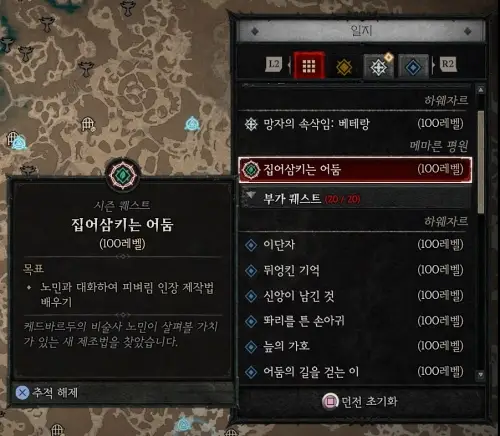 시즌2의 7개의 시즌 여정을 모두 마무리하고 나면 지르의 도살장을 오픈할 수 있는 "집어삼키는 어둠" 퀘스트가 활성화 된다. 이 퀘스트를 통해 메마른 평원의 케드바르두에 있는 비술사 노민과 대화하여 피벼림 인장 제작법을 배우게 된다.