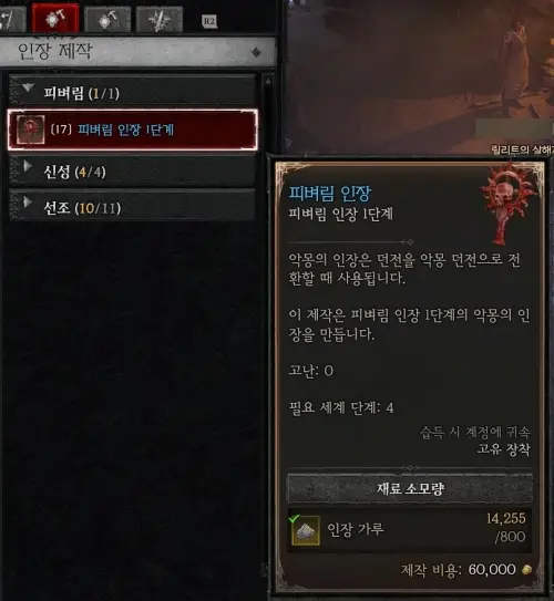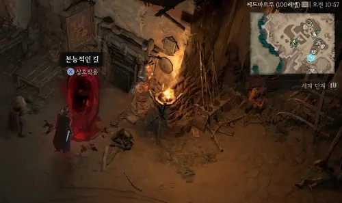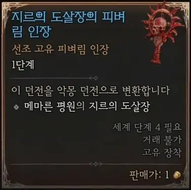 그동안 열심히 모아둔 인장 가루를 800개 사용해서 1단계 지르의 도살장의 피벼림 인장을 하나 만들었다. 설레는 마음으로 인장을 활성화 시켜보면, 메마른 평원의 케드바르두에 포털 왼쪽에 본능적인 길이라는 포털이 하나 생성된다.