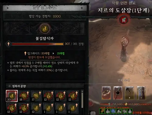 하지만, 지르의 도살장 1단계를 완료하면 문양 업그레이드를 위한 할당 가능 경험치를 무려 1000포인트를 준다. 아래 사진에 보이는 것처럼 20레벨에서 21레벨로 올리는데 361포인트가 필요한 것을 생각하면 정말 많은 포인트를 주는 것이다.
