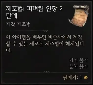 피벼림 인장을 만들기 위해서 필요한 재료가 인장을 녹이면 얻을 수 있는 "인장 가루" 인데, 피벼림 인장을 만들기 위해서는 인장 가루 800개가 소모된다. 70~80레벨의 일반 인장을 녹이면 인장가루를 19개 정도 얻는 것을 감안하면 제작 비용이 꽤나 높은 편이다.