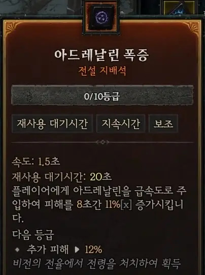 아드레날린 폭증 지배석을 통해 기본 스킬이 데미지 증가 버프를 받을 수 있다. 스타크래프트 테란의 '스팀팩'이다.