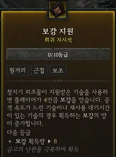도적은 보강 효과를 얻을 수 있는 스킬이 따로 없으니 보강 지원 지시석을 사용해 피해 감소 효과를 얻을 수 있다.